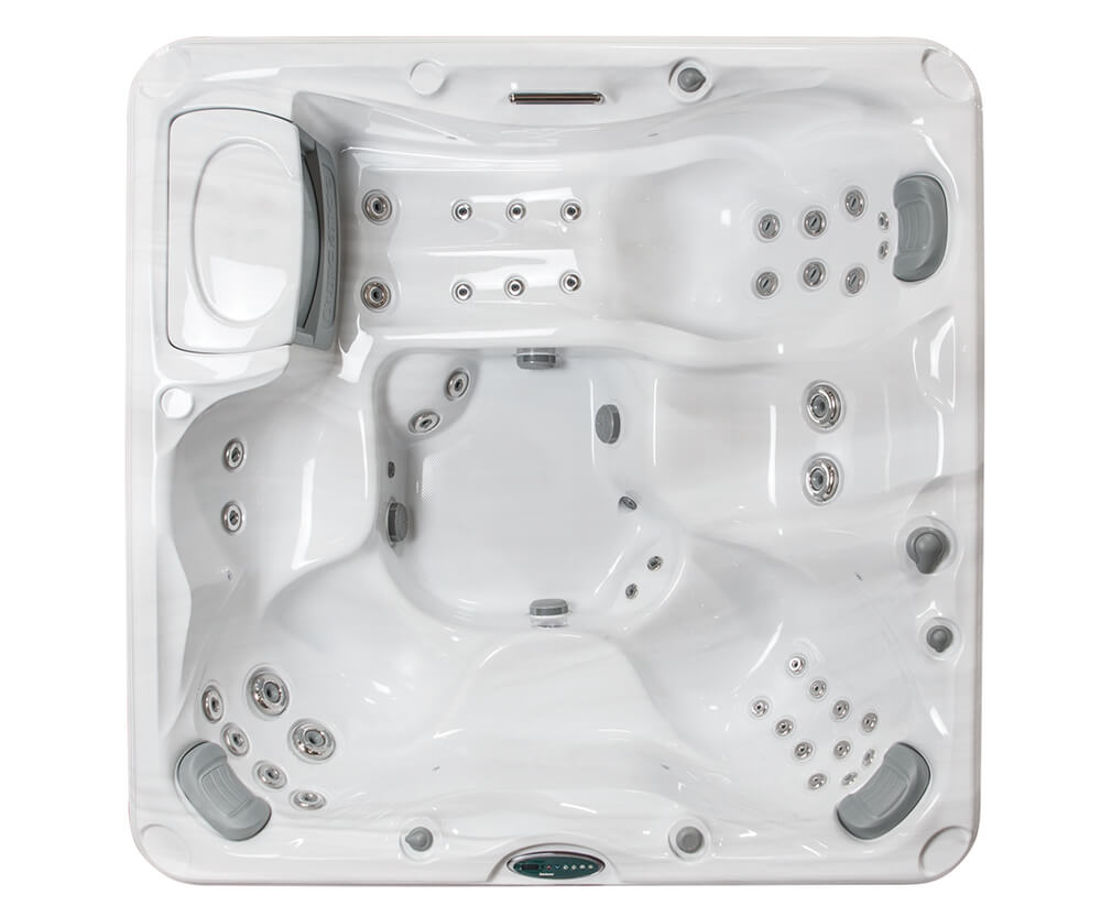 The larger dimensions of this model make the series-exclusive spiral-action lounge seat perfect for long legs. A series-exclusive Accu-Pressure™ Seat relieves tired muscles, stress and tension through deep-tissue pressure. An open footwell also makes it easy to move around and socialize while still allowing tired feet to find relief with foot jets placed in an asymmetric dome.
